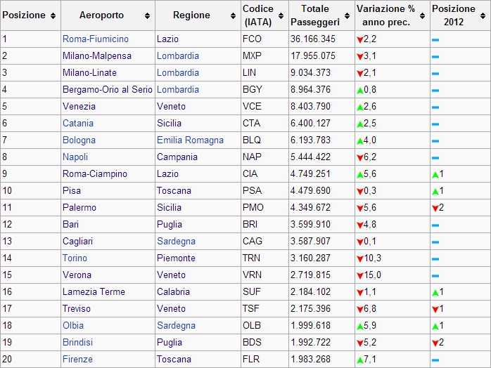 I 20 scali più trafficati d’Italia nel 2013. I dati mettono in evidenza la relatività del titolo di scalo strategico per l’aeroporto di Lamezia Terme. Fonte: Wikipedia.