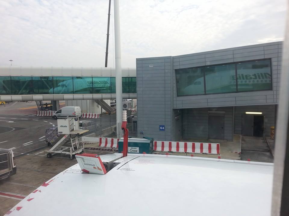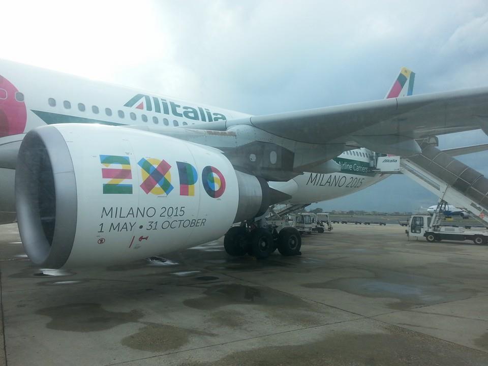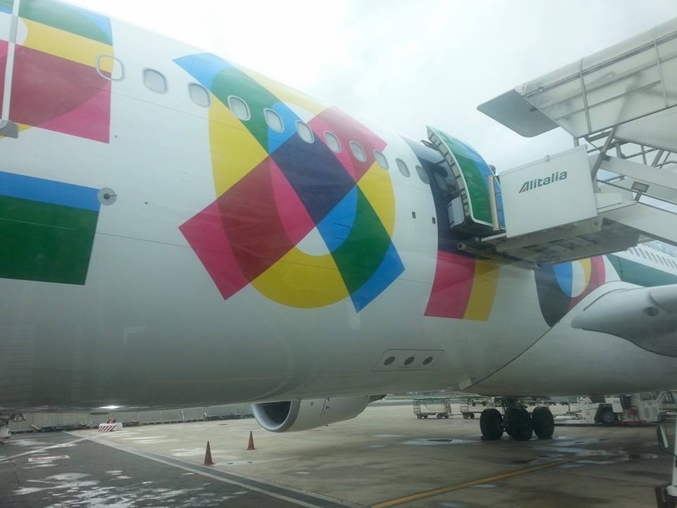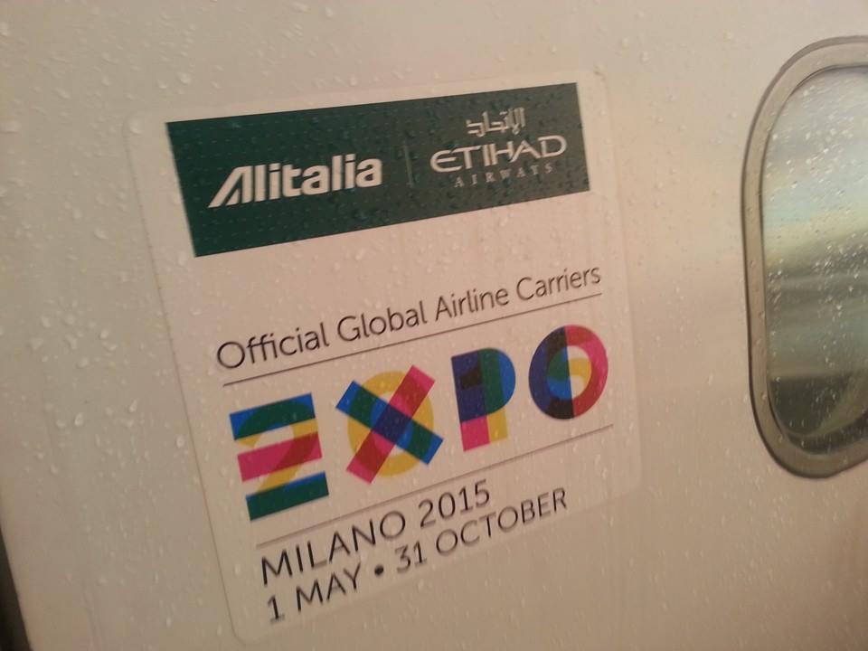 Sorpresa, parcheggiamo ai remoti. Questo renderà lo sbarco un po’ più scomodo, ma c’è anche un piccolo vantaggio: potrò scattare delle bellissime foto dell’aereo con livrea Expo Milano 2015. L’annuncio fatto a bordo specifica che per i passeggeri di classe Business è previsto un cobus dedicato per lo sbarco.