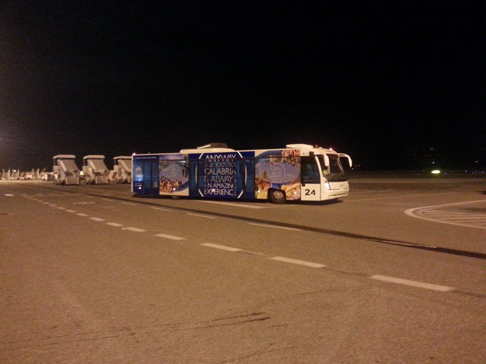 Andando agli arrivi noto per la prima volta questo cobus promozionale che riprende lo stesso stile usato sugli aerei Alitalia con livree speciali calabresi.