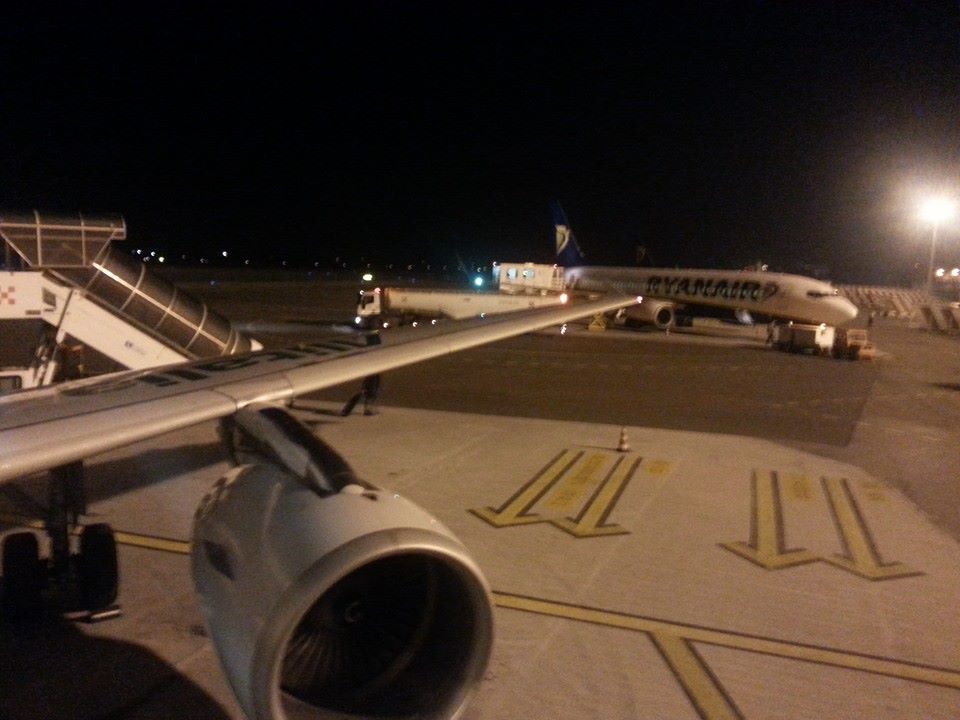 A Lamezia è già buio quando arriviamo. A fianco a noi un Boeing 737 della Ryanair.