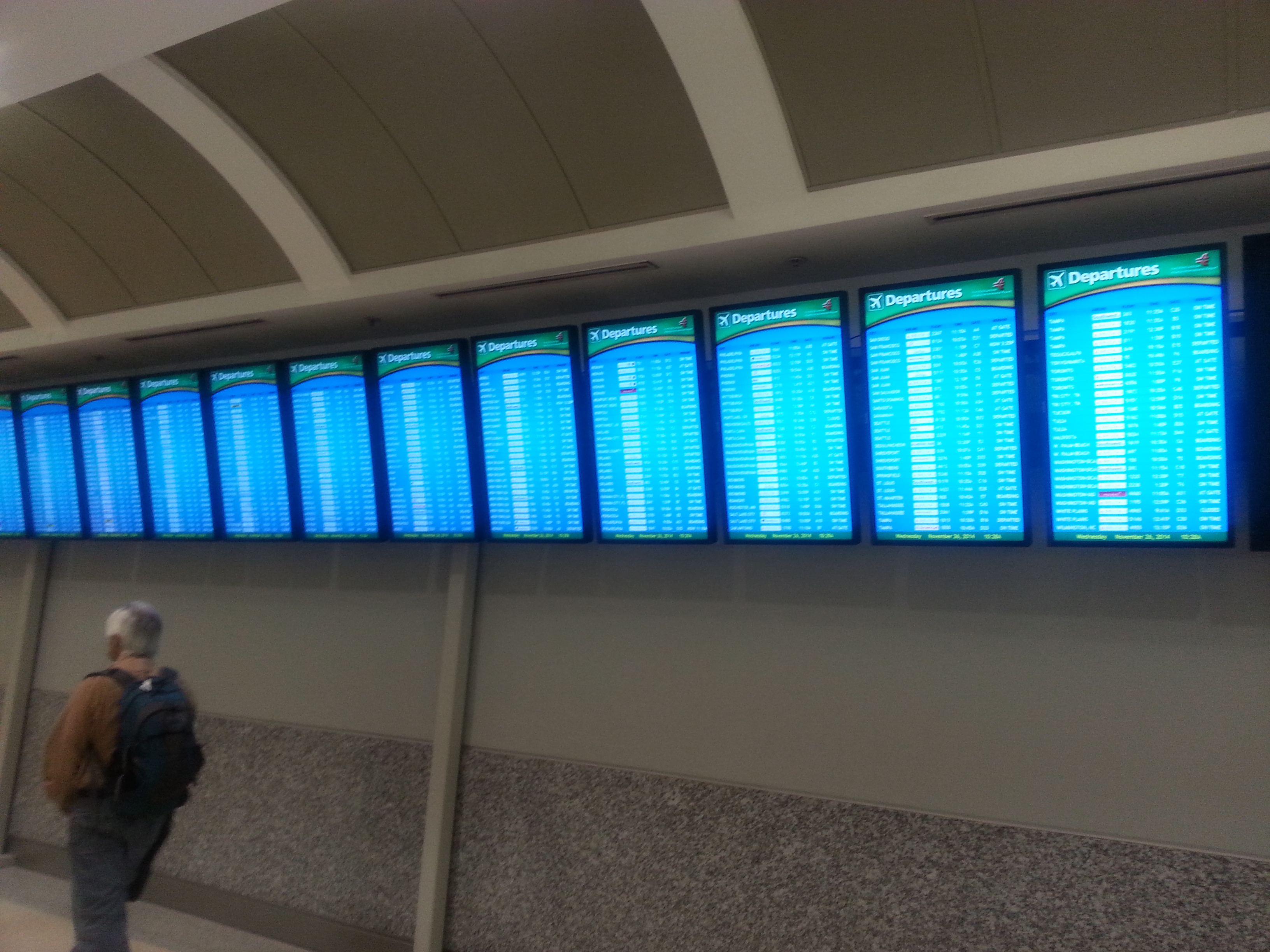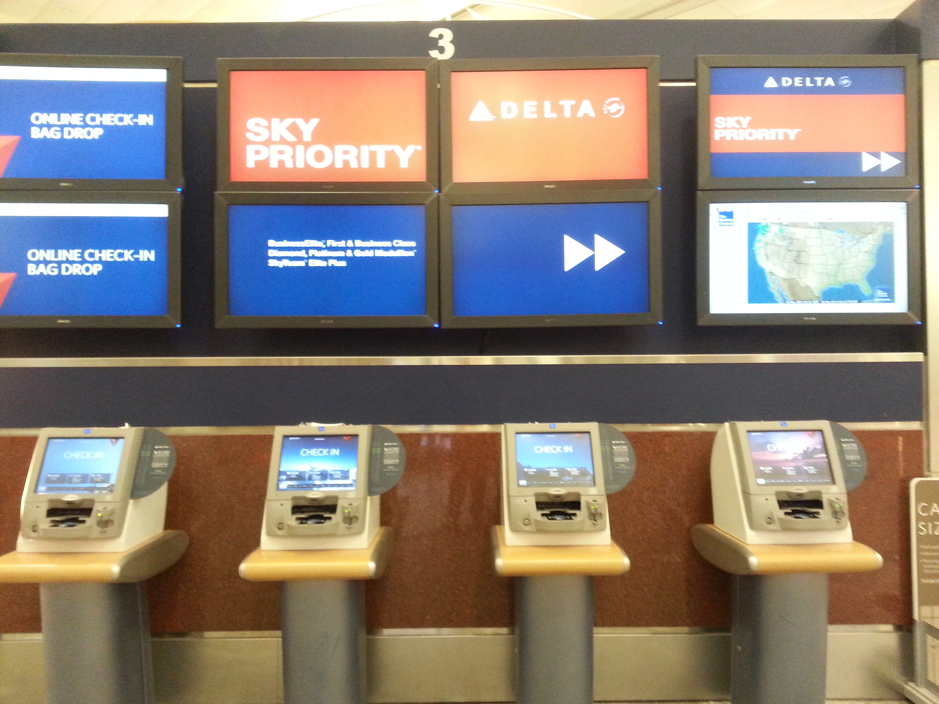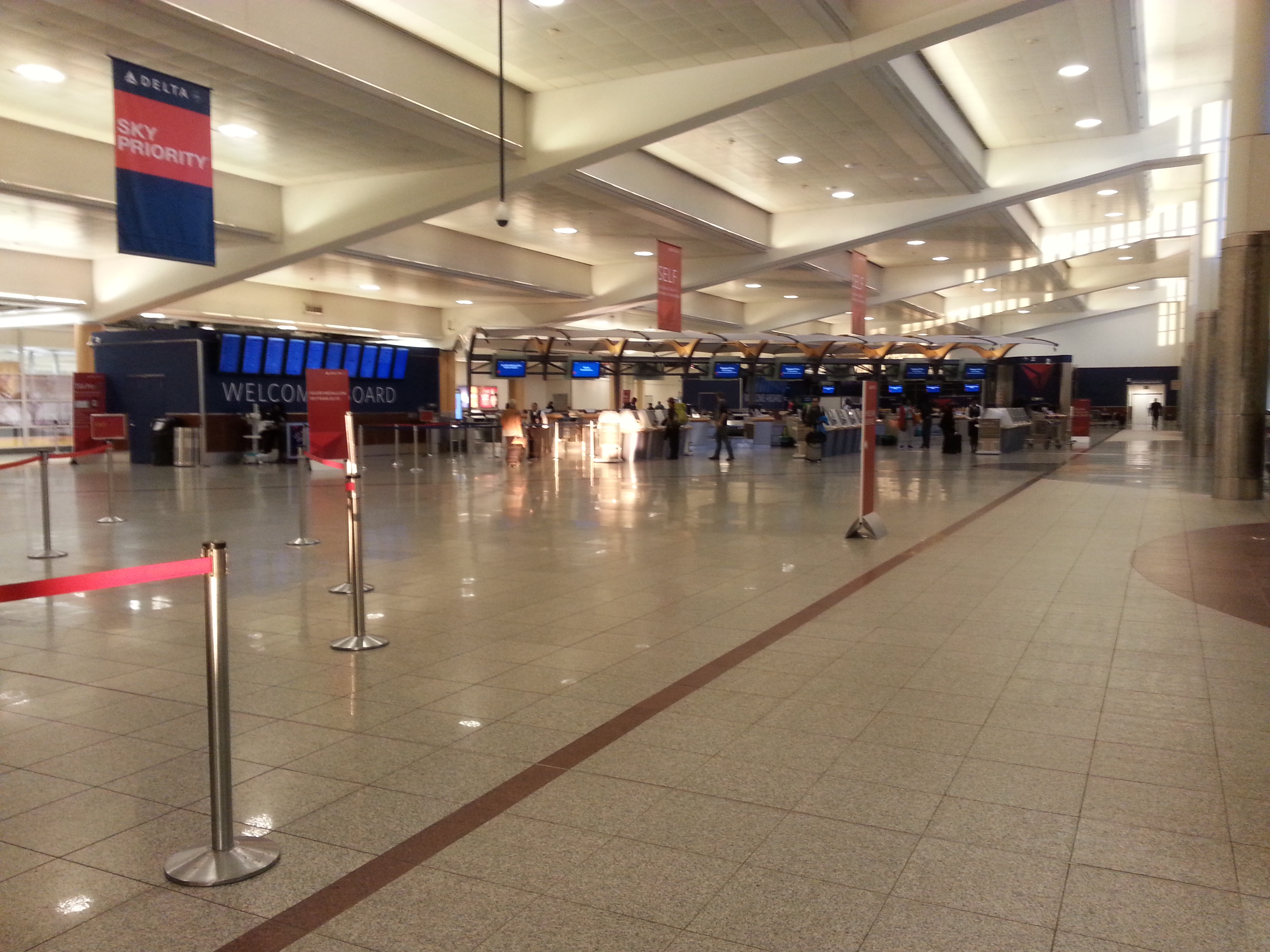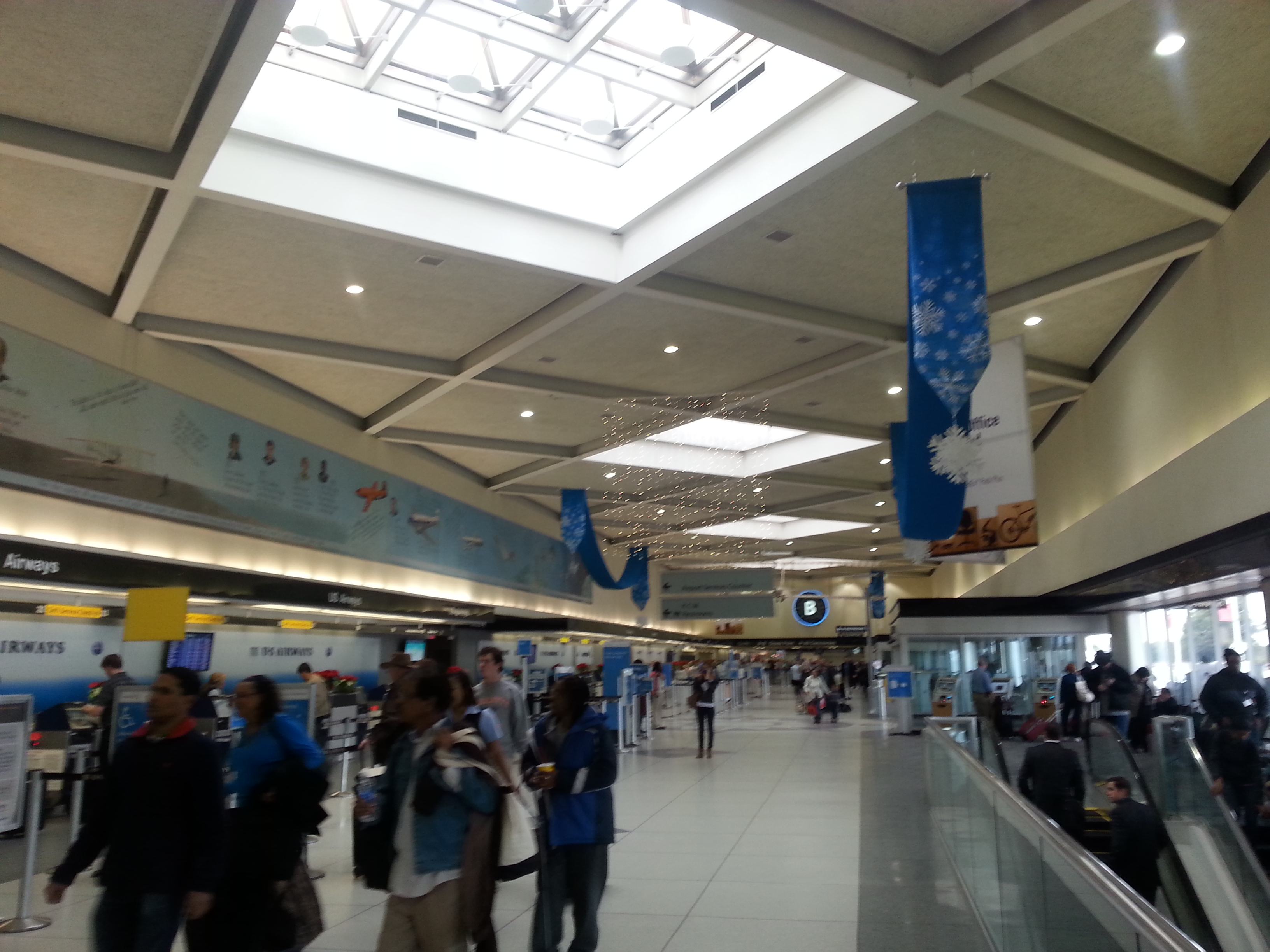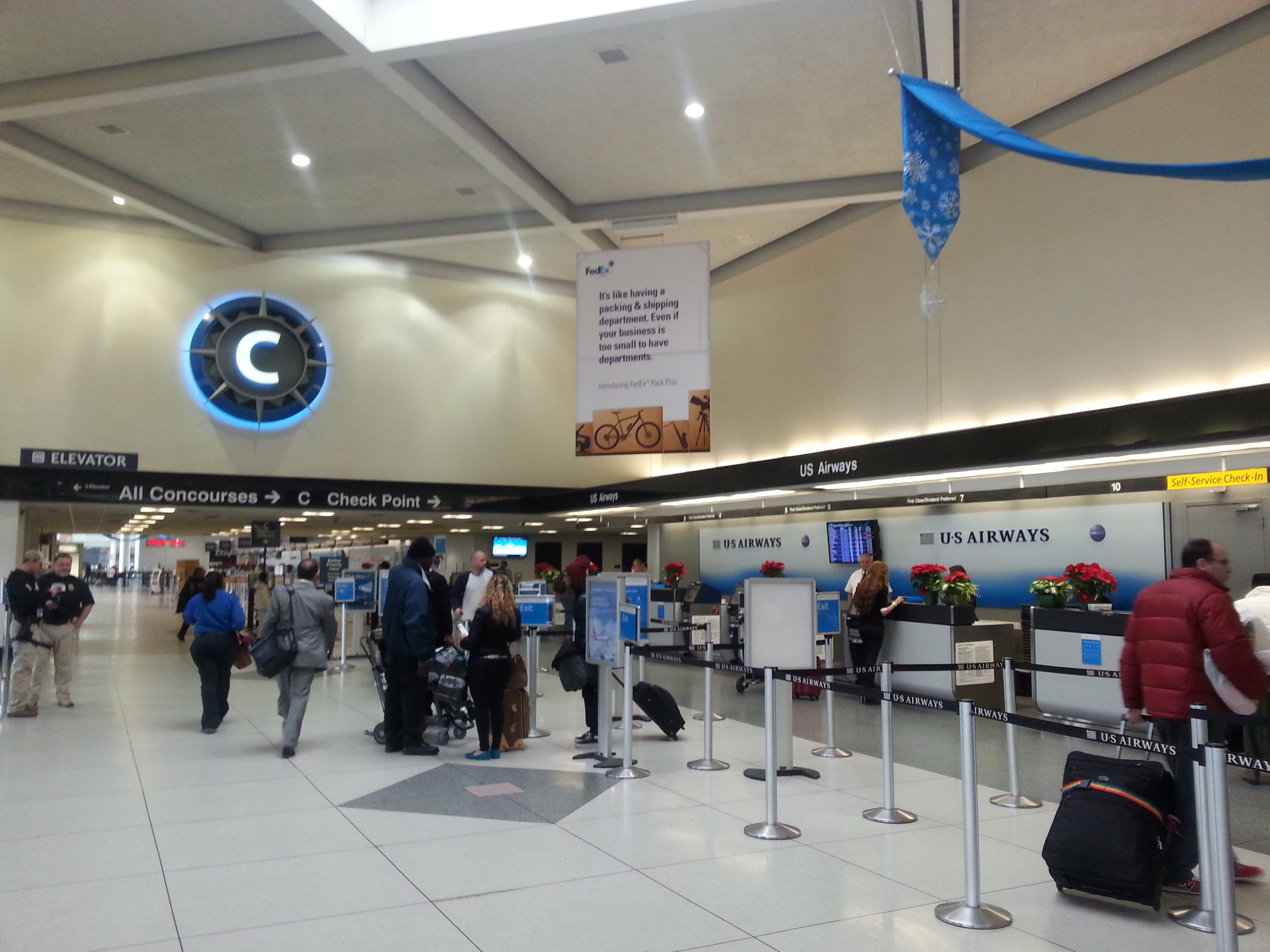 American Airlines e US Airways, in fase di fusione ormai avanzata, hanno combinato un mezzo “guaio”: il volo è AA, operato da US, e le compagnie hanno fornito due codici di prenotazione e due numeri di biglietto diversi. Per qualche strano motivo, non ho potuto stampare le carte d’imbarco al banco check-in e ho dovuto smanettare ai chioschi self check-in per ottenerle, provando più volte l’uno o l’altro codice.