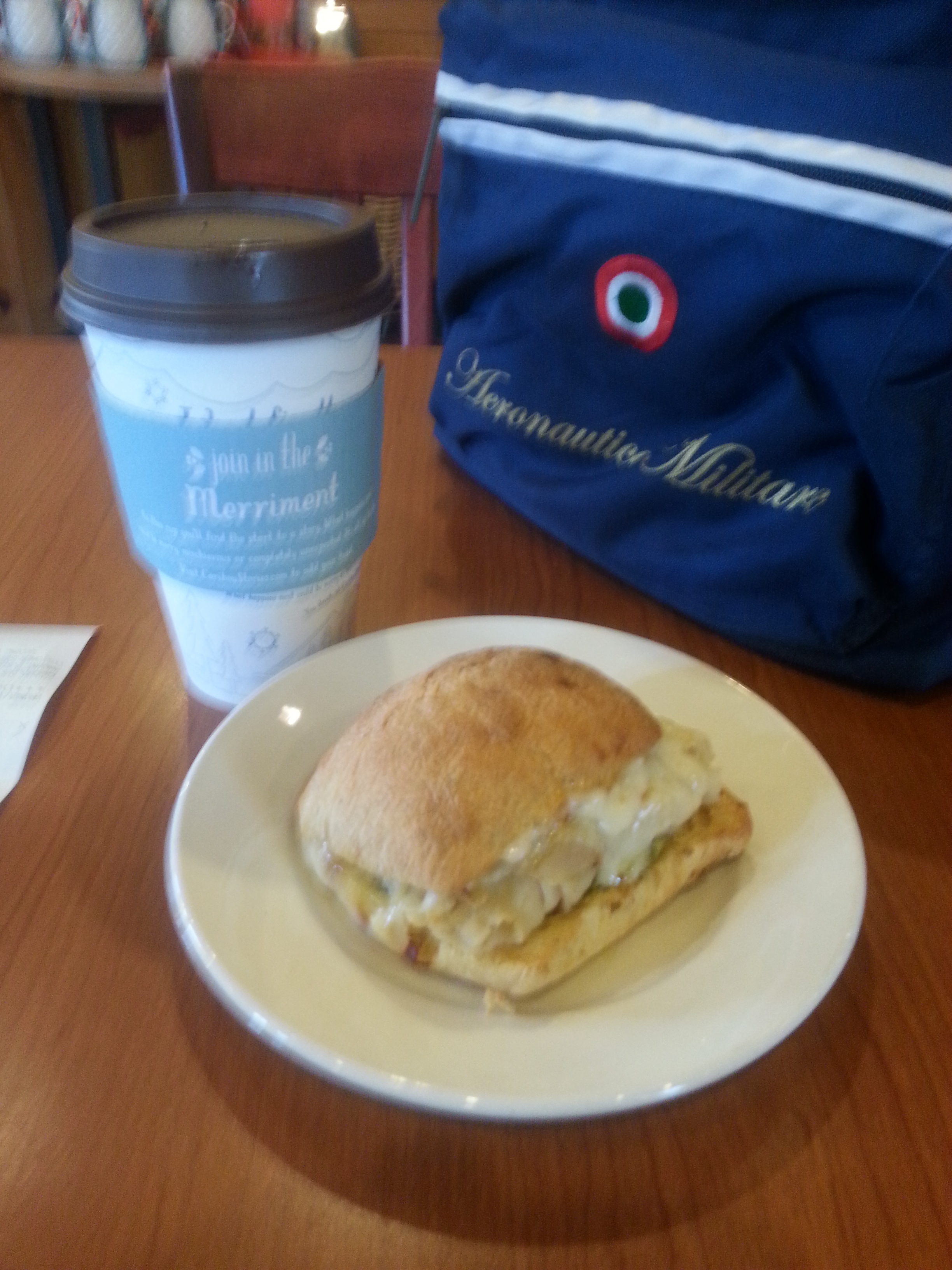 Sento qualcosa cadere per terra dietro di me. Mi giro e noto che, sorpresa, una tasca del mio zaino targato Frecce Tricolori è lacerata e un ricarica batterie è caduto per terra. Controllo per vedere se sono cadute altre cose, ma per fortuna è tutto ok. Metto tutto nella tasca centrale.