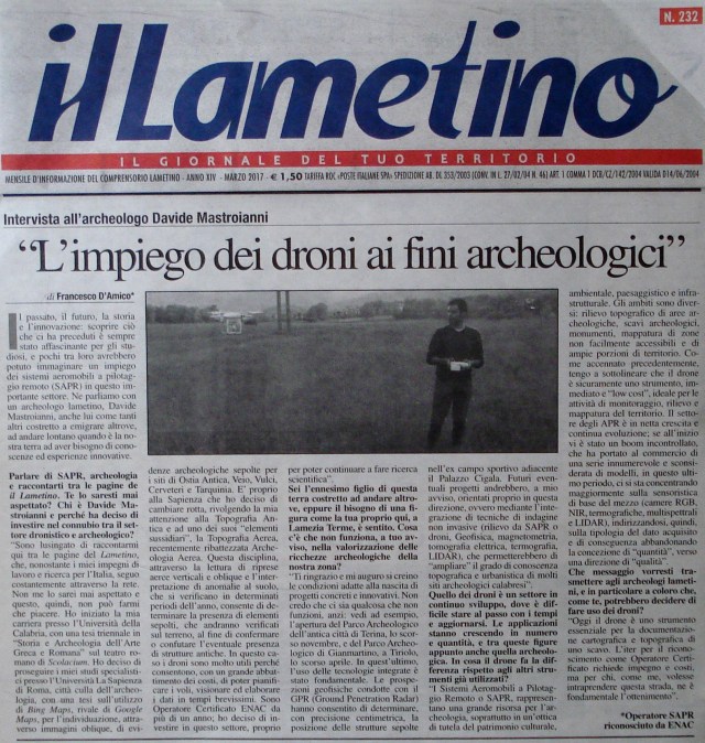 Sono lusingato di raccontarmi qui tra le pagine del Lametino, che, nonostante i miei impegni di lavoro e ricerca per l’Italia, seguo costantemente attraverso la rete. Non me lo sarei mai aspettato e questo, quindi, non può farmi che piacere. Ho iniziato la mia carriera presso l’Università della Calabria, con una tesi triennale in “Storia e Archeologia dell’Arte Greca e Romana” sul teatro romano di Scolacium. Ho deciso di proseguire i miei studi specialistici presso l’Università La Sapienza di Roma, città culla dell’archeologia, con una tesi sull’utilizzo di Bing Maps, rivale di Google Maps, per l’individuazione, attraverso immagini oblique, di evidenze archeologiche sepolte per i siti di Ostia Antica, Veio, Vulci, Cerveteri e Tarquinia. E’ proprio alla Sapienza che ho deciso di cambiare rotta, rivolgendo la mia attenzione alla Topografia Antica e ad uno dei suoi “elementi sussidiari”, la Topografia Aerea, recentemente ribattezzata Archeologia Aerea. Questa disciplina, attraverso la lettura di riprese aeree verticali e oblique e l’interpretazione di anomalie al suolo, che si verificano in determinati periodi dell’anno, consente di determinare la presenza di elementi sepolti, che andranno verificati sul terreno, al fine di confermare o confutare l’eventuale presenza di strutture antiche. In questo caso i droni sono molto utili perché consentono, con un grande abbattimento dei costi, di poter pianificare i voli, visionare ed elaborare i dati in tempi brevissimi. Sono Operatore Certificato ENAC da più di un anno; ho deciso di investire in questo settore, proprio per poter continuare a fare ricerca scientifica. A cavallo tra il 2012 e il 2013, ho frequentato il primo anno della Scuola di Specializzazione in Archeologia, presso l’Università del Salento, sospesa, in quanto vincitore, l’anno successivo, del concorso di Dottorato in “Architettura, Design e Beni Culturali”, presso l’Università della Campania “Luigi Vanvitelli”, ex Seconda Università di Napoli, conclusosi lo scorso 13 gennaio 2017, con un tesi in Topografia Antica, dal titolo “Carta Archeologica e Ricerche in Abruzzo. Il comune di Campli (TE)”, e in corso di pubblicazione, unicum per l’Abruzzo. Nel corso degli anni ho collaborato, come studente, a numerosi scavi universitari promossi da diverse cattedre di Archeologia (Cosenza, Roma, Siena, Venezia, Lecce), in qualità di libero professionista (Roma, Cosenza, Lamezia Terme) che ancora oggi svolgo e collaboro con la Soprintendenza Archeologia, Belle Arti e Paesaggio della Regione Abruzzo. Ho al mio attivo diverse pubblicazioni scientifiche nazionali e internazionali, partecipazioni a convegni (il prossimo sarà proprio in Calabria, a Reggio, a fine aprile), borse di studio, progetti di ricerca e soggiorni all’estero (Spagna e Albania).