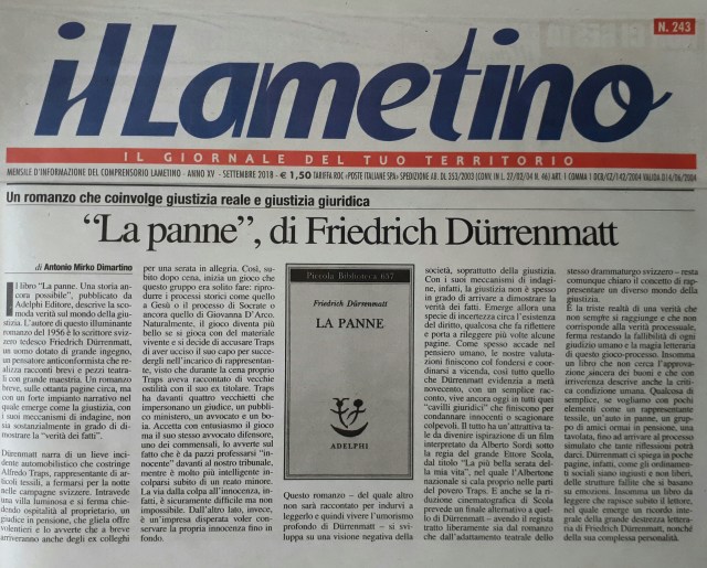 Il libro “La panne. Una storia ancora possibile”, pubblicato da Adelphi Editore, descrive la scomoda verità sul mondo della giustizia. L’autore di questo illuminante romanzo del 1956 è lo scrittore svizzero tedesco Friedrich Dürrenmatt, un uomo dotato di grande ingegno, un pensatore anticonformista che realizza racconti brevi e pezzi teatrali con grande maestria. Un romanzo breve, sulle ottanta pagine circa, ma con un forte impianto narrativo nel quale emerge come la giustizia, con i suoi meccanismi di indagine, non sia sostanzialmente in grado di dimostrare la “verità dei fatti”.
