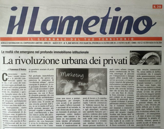 Nel profondo immobilismo istituzionale che spesso caratterizza la mancanza di “rivoluzioni urbane”, spesso emergono le prodezze, se così possiamo definirle, di piccoli e medi investitori i quali avviano un’attività e contribuiscono, sia col flusso di clientela generato che con l’abbellimento architettonico di interi edifici, a rivalutare un’intera zona. Si assiste ad una crescita generale dell’area, in cui in media nell’arco della giornata passano più persone rispetto a prima, le quali contribuiscono a dare uno slancio anche alle attività circostanti, il tutto secondo un meccanismo a feedback positivo che crea benessere e avvia la rivoluzione urbana tanto attesa e che l’istituzione non riesce a portare. Immaginate, per esempio, cosa accade a un quartiere che ospita l’ufficio regionale o nazionale di un’azienda, la sede distaccata di un ateneo, un ristorante di prestigio, un importante centro medico privato: tutto intorno si instaura un meccanismo che ruota intorno all’infrastruttura e dà beneficio generale tramite il mantenimento di posti di lavoro e il contributo alla nomea della città che ospita l’attività commerciale. Vedremo nascere bar, altre attività legate allo svago e agli alimentari, vedremo uno sportello bancario per i prelievi, vedremo altre realtà decidere di creare la propria sede nella zona rivalutata, vedremo nuove e rivitalizzate strutture ricettive, vedremo persone trasferirsi in quel centro urbano (magari prima caratterizzato da una sola emorragia di persone per l’emigrazione) e dunque pagare affitti nonché tutti i servizi accessori, e il meccanismo ripartirà dal principio, rinforzandosi secondo un circolo virtuoso. Infine, si arriva anche alla crescita turistica, dato che un’area ben curata e con una base di clientela fissa cresciuta e costante può contare su un maggior apporto di potenziali turisti e quindi rivalutare il proprio patrimonio artistico e storico che il visitatore forestiero può imparare a conoscere ed apprezzare durante i tempi morti del proprio viaggio. Sembra una buona dose di ottimismo infuso ma non si discosta molto dalla possibile realtà di un centro urbano che soffre la mancanza di flussi economici e di una sana crescita commerciale. Va, senza ombra di dubbio, considerato che è compito delle amministrazioni curare aspetti imprescindibili come la manutenzione stradale, gli impianti luminari e i servizi di base come fogne, rete idrica e rete elettrica, e chissà che una piccola rivoluzione urbana avviata dai privati non serva da maggior sprono alle istituzioni a decidersi per impegnarsi in modo attivo nei confronti nel benessere generale urbano, che dà benefici a tutti. Diventa poi molto difficile per le istituzioni stare indietro rispetto alla rivoluzione urbana, e decideranno – di conseguenza – di stare al passo coi tempi e migliorare la propria efficienza. Almeno, questo è quanto accade di norma nei paesi ricchi del globo.