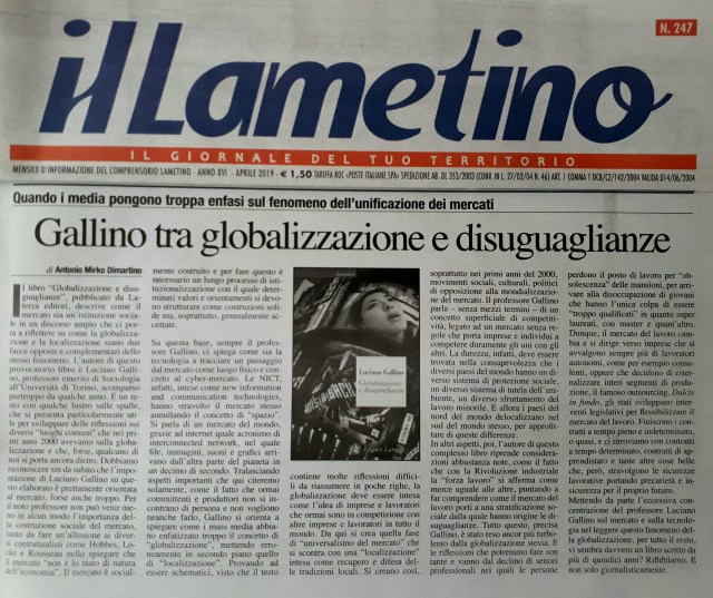 Mettendo da parte l’eccessiva concentrazione del professore Luciano Gallino sul mercato e sulla tecnologia nel leggere questo fenomeno della globalizzazione, per tutto il resto, vi sembra davvero un libro scritto da più di quindici anni? Riflettiamo. E non solo giornalisticamente.